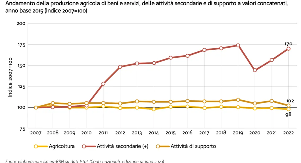 E’ di 6,2 miliardi di euro il valore della produzione delle attività secondarie in Italia e 1,5 miliardi provengono proprio dal settore degli agriturismi che rappresenta il 30% delle attività secondarie in Europa. Complessivamente, tra il 2007 e il 2022, le attività se- condarie sono cresciute del 70% – contro il 2% delle attività di supporto e il calo (-0,2%) dell’intero settore agricolo – a un tasso di variazione medio annuo (tvma) del 3,6%