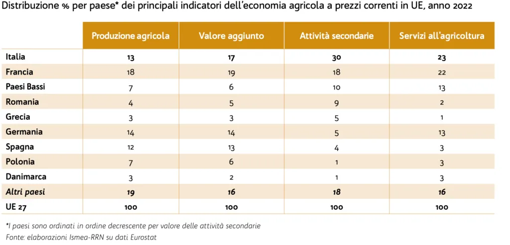 L’agricoltura italiana si conferma protagonista in Europa, terza per valore della produzione col 13% dopo Francia (18%) e Germania (14%) e seconda per valore aggiunto dopo la Francia, continuando a mantenere il primato per valore della produzione delle attività secondarie e dei servizi, rispettivamente con il 30% e il 23% del totale europeo.