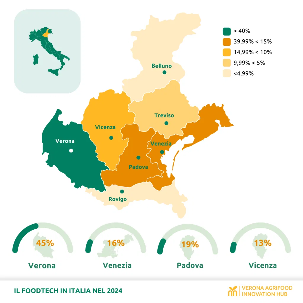 Secondo le analisi di VAIH, le startup AgriFoodTech italiane sono concentrate prevalentemente nel Nord Italia, che ospita il 50% delle realtà attive: Lombardia (31%), Piemonte (10%) e Veneto (9,7%) sono in classifica insieme a Emilia-Romagna (11%) e Lazio (9,7%). Al contrario, il Sud Italia, fatica ad emergere nonostante il suo notevole potenziale agricolo, rivelandosi un ecosistema imprenditoriale ancora poco sviluppato.