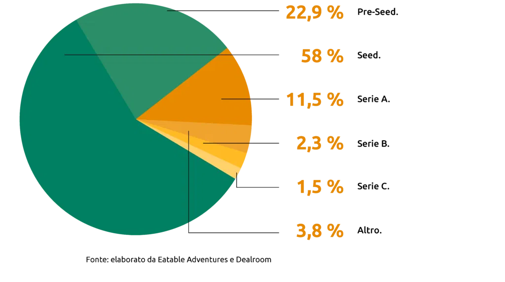 Cresce l’attenzione verso i progetti in fase pre-seed e seed, caratterizzati da requisiti di capitale più modesti e minore rischio per gli investitori. Attualmente, il 58% delle startup AgriFoodTech si trova nella fase seed, un aumento del 15% rispetto al 2023. Tuttavia, molte di queste realtà faticano a superare le fasi iniziali di sviluppo, e solo il 2,3% raggiunge la fase Serie B o successiva, evidenziando difficoltà nel processo di scalabilità.