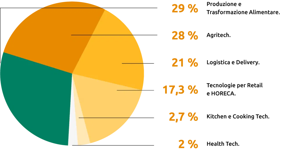 Tra i settori in crescita spiccano Logistica e Delivery (21%) – che mostra una forte centralità della categoria delivery&last mile (45%) e packaging (21%) -, seguiti da Retail e Horeca (17%), tecnologie per la Cucina e la Preparazione alimentare (3%) e, infine, Health Tech (2%) di cui fanno parte tecnologie per la nutrizione e la nutraceutica.