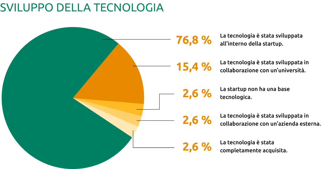 Il 77% delle startup sviluppa le tecnologie in-house, con l’intelligenza artificiale al primo posto (43%) per la sua versatilità e capacità di adattarsi a diversi settori, seguita da Biotecnologie (32%) e piattaforme digitali (30%). Tuttavia, solo il 15% delle innovazioni deriva da collaborazioni con università, evidenziando la necessità di rafforzare le sinergie tra ricerca accademica e imprenditorialità.