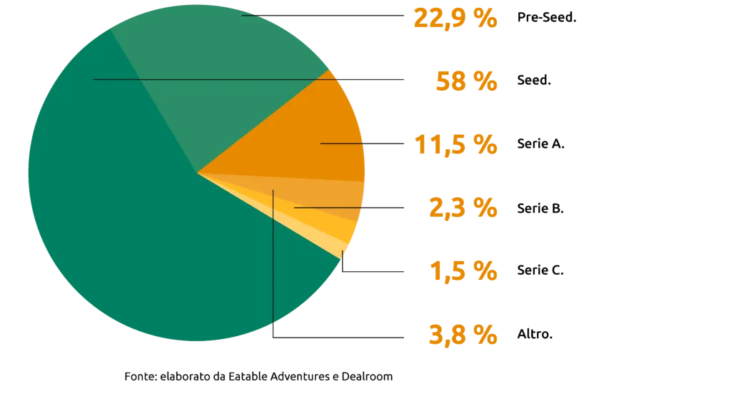 Cresce l’attenzione verso i progetti in fase pre-seed e seed, caratterizzati da requisiti di capitale più modesti e minore rischio per gli investitori. Attualmente, il 58% delle startup AgriFoodTech si trova nella fase seed, un aumento del 15% rispetto al 2023. Tuttavia, molte di queste realtà faticano a superare le fasi iniziali di sviluppo, e solo il 2,3% raggiunge la fase Serie B o successiva, evidenziando difficoltà nel processo di scalabilità.