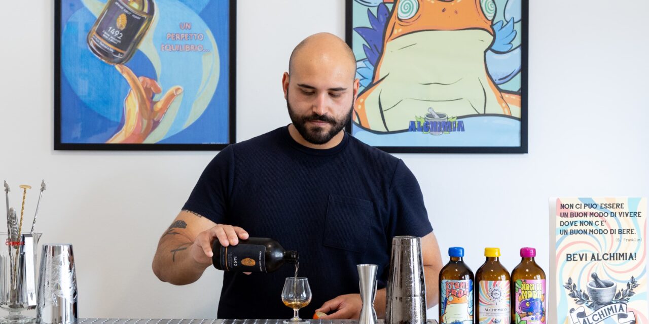 La storia di Giacomo è quella di un alchimista moderno, che ha deciso di applicare le leggi della chimica alla produzione artigianale al naturale, ma con un approccio che si distacca completamente dalle convenzioni industriali. “Alchimia nasce da me, dopo tanti anni di esperienza come bartender –  racconta Giacomo –  ho iniziato a sviluppare liquori e amari che usavo nei locali dove lavoravo, circa 8-9 anni fa. Poi, con l’arrivo del Covid, ho trovato un vecchio manuale di Luigi Sala, un liquorista storico, e ho cominciato a studiare in modo approfondito. Ho eliminato tutto ciò che era chimica e ho iniziato a sperimentare.”