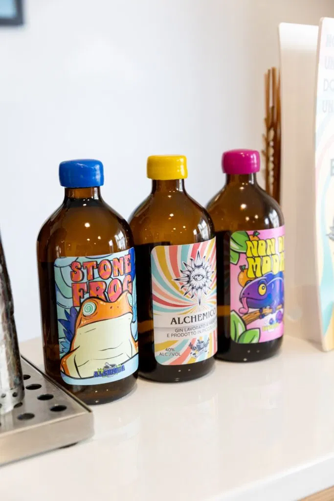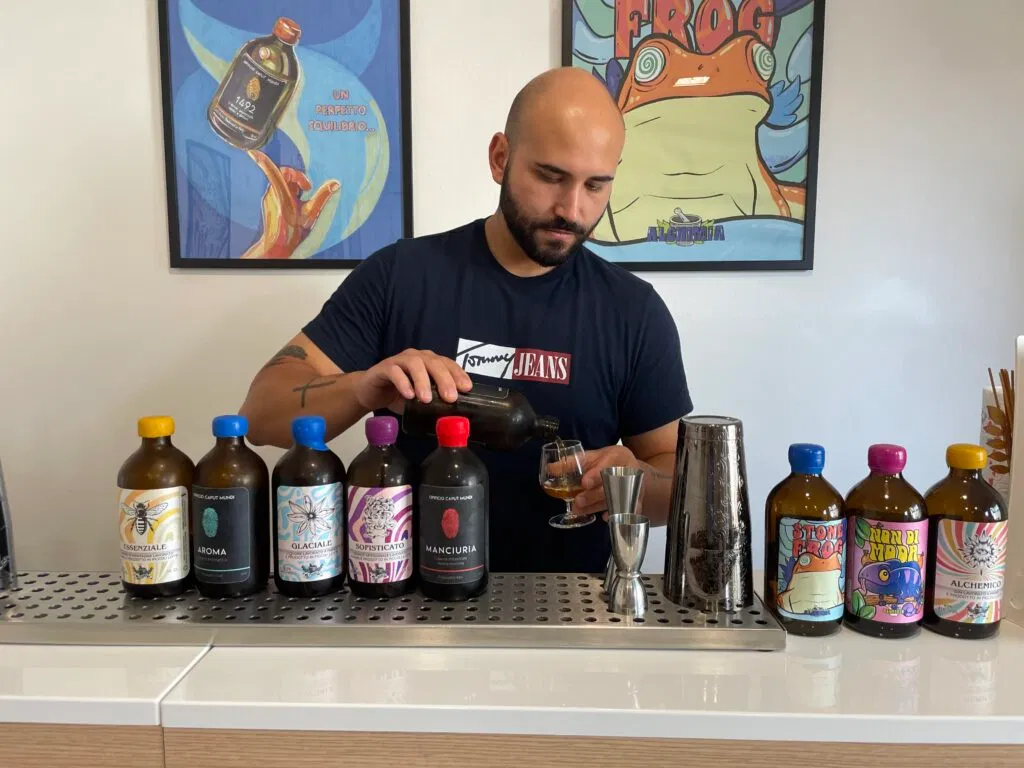 La storia di Giacomo è quella di un alchimista moderno, che ha deciso di applicare le leggi della chimica alla produzione artigianale al naturale, ma con un approccio che si distacca completamente dalle convenzioni industriali. “Alchimia nasce da me, dopo tanti anni di esperienza come bartender – racconta Giacomo – ho iniziato a sviluppare liquori e amari che usavo nei locali dove lavoravo, circa 8-9 anni fa. Poi, con l’arrivo del Covid, ho trovato un vecchio manuale di Luigi Sala, un liquorista storico, e ho cominciato a studiare in modo approfondito. Ho eliminato tutto ciò che era chimica e ho iniziato a sperimentare.”