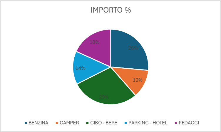 Dal grafico delle spese, emerge che la voce che ha inciso maggiormente sul budget complessivo è quella relativa a cibo e bevande, che ha rappresentato il 29% della spesa totale. Seguono la benzina, con il 26%, confermando che gli spostamenti hanno avuto un impatto significativo sui costi. Al terzo posto ci sono i pedaggi, che hanno assorbito il 18% del budget, seguiti dalle spese per parcheggi e hotel, pari al 14%. Infine, la voce meno significativa è stata quella del noleggio del camper, che ha rappresentato solo il 12% della spesa complessiva. Quest’ultima voce, sebbene importante, è variabile, poiché il costo dipende anche dalla stagione del noleggio.