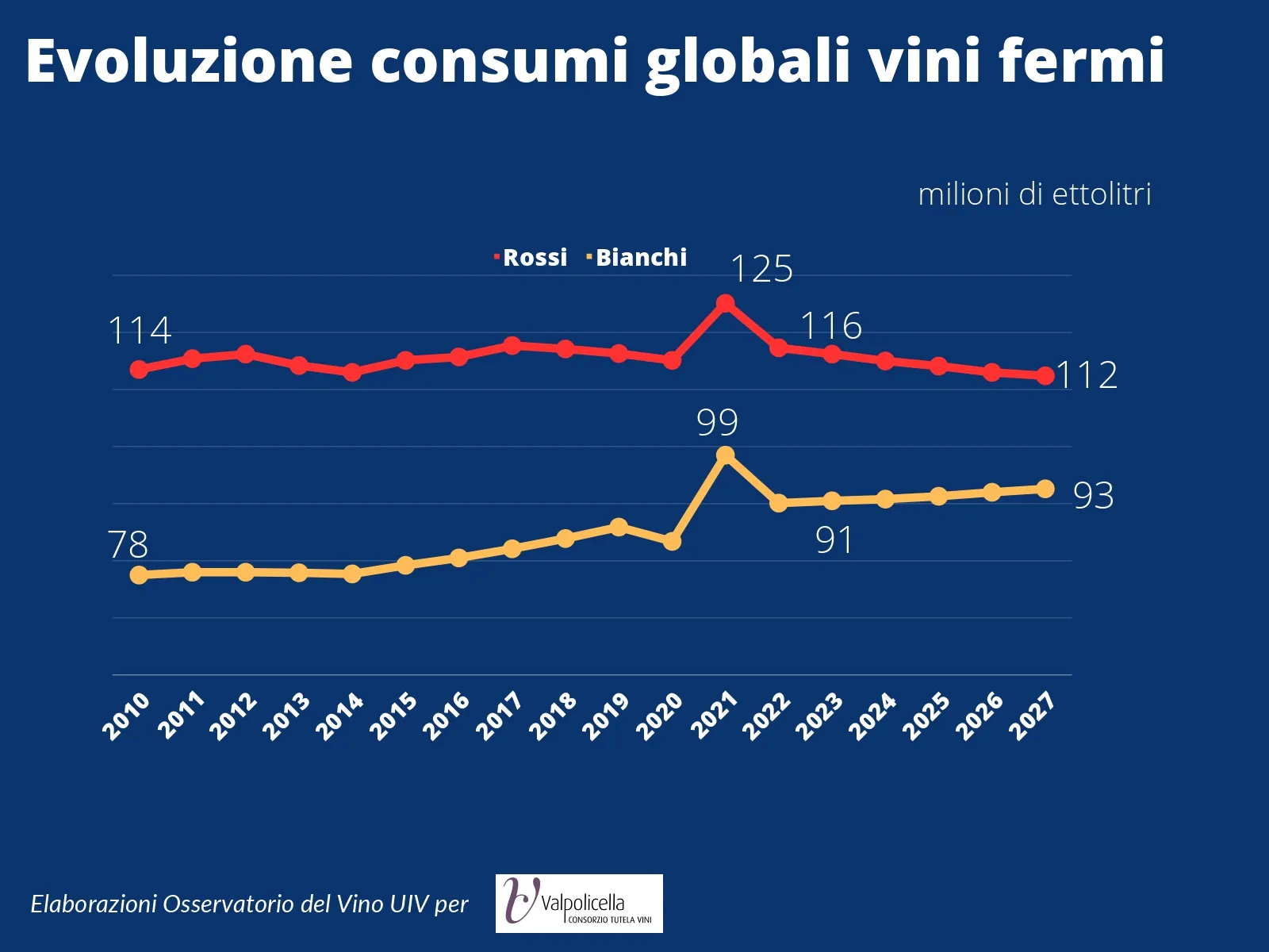 Amarone, la Valpolicella si interroga sul suo futuro dopo la discesa dei vini rossi, solo congelata dal rimbalzo post Covid ma resa verticale da un 2023 negativo. Un cambio nei consensi che è già in atto da tempo. Complice un mix di fattori generazionali ed etnici – ma anche climatici – i palati di tutto il mondo stanno progressivamente spostando le proprie preferenze verso tipologie di alcolici diverse dal vino, e in particolare dal suo colore simbolo.