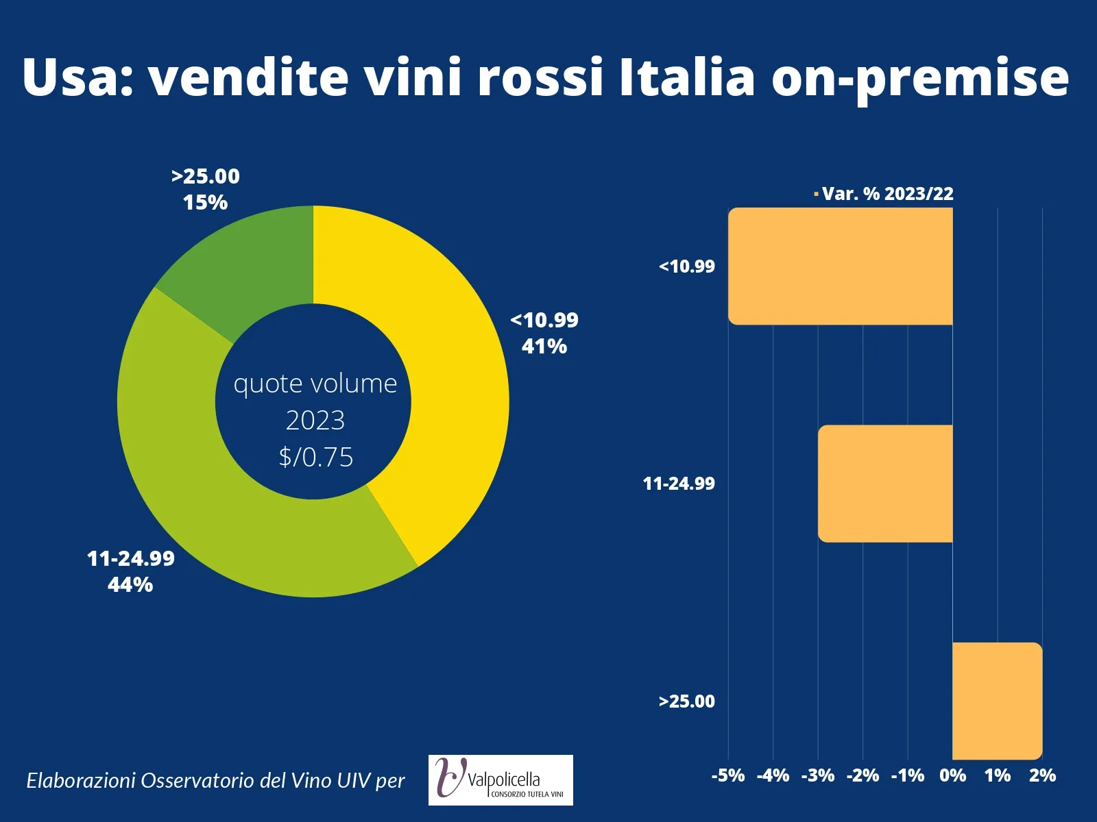 Negli Usa, per esempio, a fronte di vendite generali di vino rosso italiano a -9% nel canale più profittevole, quello dell’on-premise (ristorazione, locali, hotel), l’unica fascia di prezzo che è riuscita a strappare aumenti è quella all’ingrosso sopra i 25 dollari a bottiglia (+2%). Da qui devono ripartire i prodotti italiani, dimenticando il concetto di rosso da “mass market” e coltivando forti valori di identità e coerenza territoriale e stilistica”.