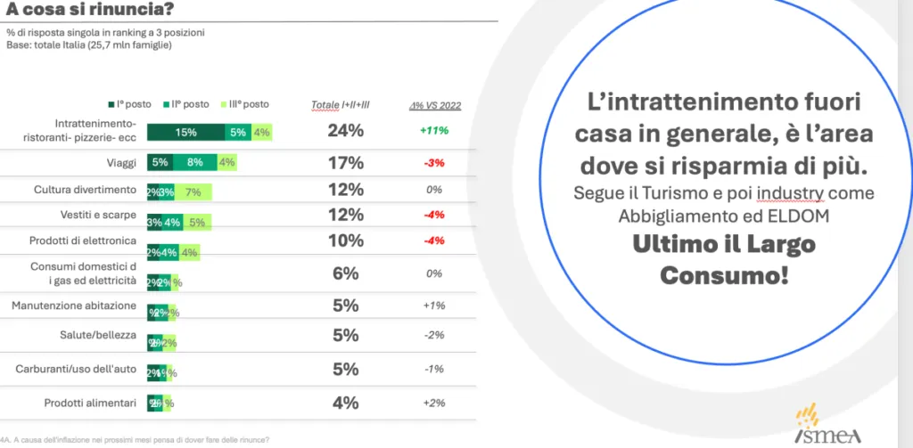 L’intrattenimento fuori casa in generale, è l’area dove si risparmia di più. Segue il Turismo e poi Industry come l’abbigliamento la salute e bellezza e, infine i prodotti alimentari. Alla domanda: “A causa dell’inflazione nei prossimi mesi pensa di divora fare delle rinunce?”, il 24% ha risposto che rinuncerebbe a ristoranti, intrattenimento, pizzerie ecc…, il 17% ai viaggi, il 12% alla cultura e divertimento, il 12% ai vestiti o scarpe, il 10% ai prodotti di elettronica, il 5% a salute e bellezza e infine il 4% ai prodotti alimentari.