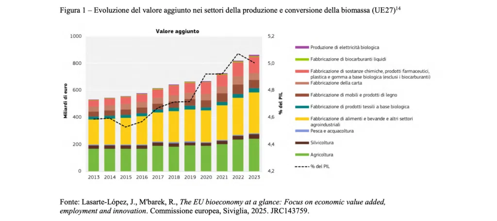 Nel 2023, nell’UE, le attività di produzione e conversione della biomassa occupavano 17,1 milioni di persone (8 % dei posti di lavoro nell’UE) e generavano 863 miliardi di EUR di valore aggiunto (5 % del prodotto interno lordo dell’UE)9. Nel 202310 gli investimenti in attività di ricerca e sviluppo nei settori connessi alla bioeconomia hanno raggiunto i 23,2 miliardi di EUR (9 % di tutti gli investimenti in tali attività), mentre i brevetti in questi settori hanno rappresentato il 5 % di tutti i brevetti depositati nell’UE tra il 2008 e il 202011.