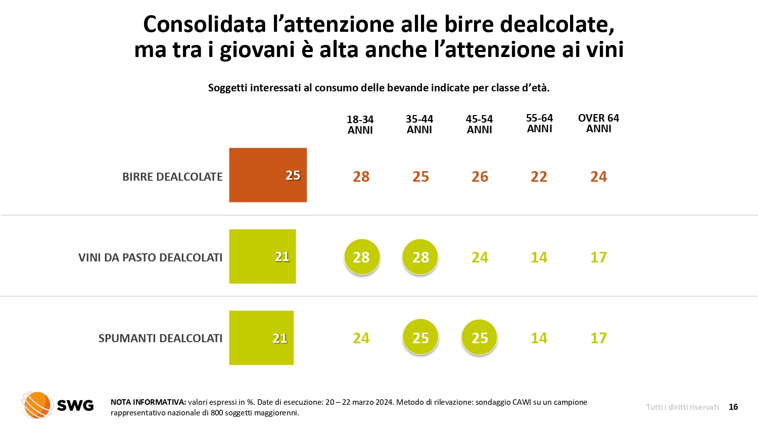 Di certo, le birre analcoliche godono oggi di un vantaggio competitivo sul vino abbastanza netto: l’interesse di cui godono è trasversale rispetto all’età mentre il vino senza alcol interessa consumatori sino a 44 anni.