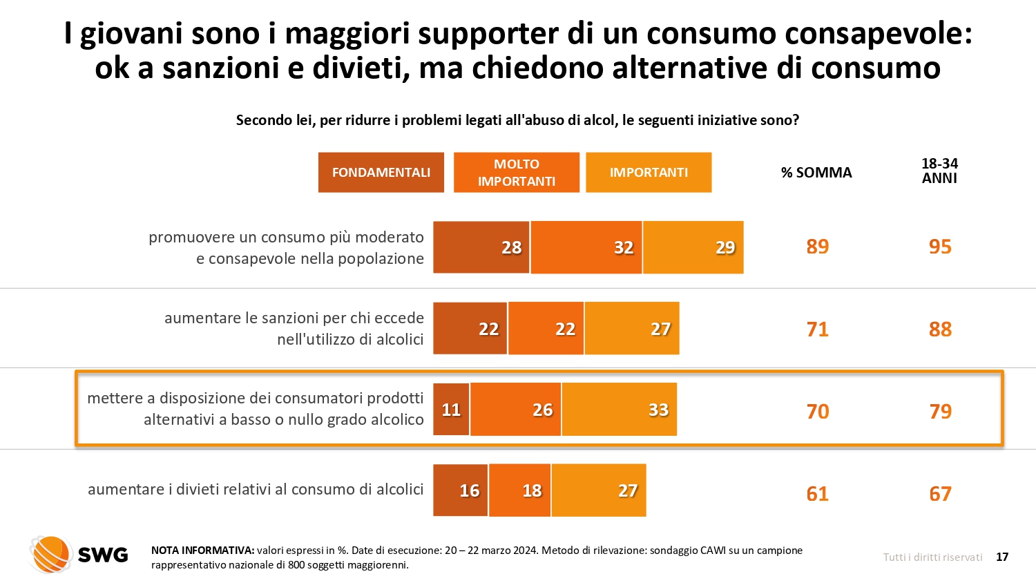 Un sondaggio SWG appena pubblicato fornisce una risposta abbastanza chiara: il 36% del mercato è interessato al no-alcohol. Si tratta di un milione di nuovi consumatori e la percentuale passa al 16% fra i non bevitori, al 37/% fra i consumatori occasioni ed al 42% per chi invece consuma abitualmente vini e alcolici.