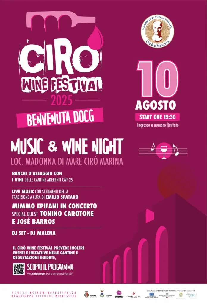 Il momento clou sarà il 10 agosto ai Mercati Saraceni di Cirò Marina: un grande brindisi collettivo, banchi di assaggio con le cantine del Consorzio di Tutela, piatti tipici e musica dal vivo. Sul palco, Emilio Spataro, Mimmo Epifani con Tonino Carotone, José Barros e il DJ set di Malena.