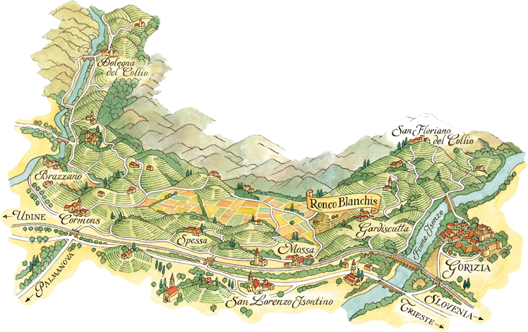 Ronco Blanchìs si trova nel borgo rurale di Mossa, nel cuore della denominazione. Il nome dell’azienda è un toponimo che unisce le due caratteristiche più significative del territorio: le colline, con la parola locale “ronco”, e Blanchìs, ad esprimere la forte vocazione alla produzione di grandi vini bianchi.