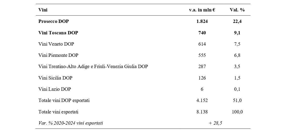 Ripartizione export vitivinicolo – Nel 2024 il valore complessivo delle esportazioni di vino all’estero è stato pari a 8.138 milioni di euro: di questi 4.152 milioni, pari al 51,0% del totale esportato, è riconducibile a vini di denominazione di origine protetta. Una quota pari al 22,4% del totale del valore esportato, pari a 1,8 miliardo di euro, si riferisce al prosecco, 740 milioni a vini DOP della Toscana (9,2%) e 614 milioni a vini DOP del Veneto. L’Asti spumante apporta un contributo di 166 milioni di euro e dalla regione Piemonte provengono altri 389 milioni, per un totale di 555 milioni di euro. Altre regioni, come il Trentino e il Friuli, contribuiscono per 287 milioni, mentre valori più contenuti per la domanda estera si riferiscono alla Sicilia e al Lazio.