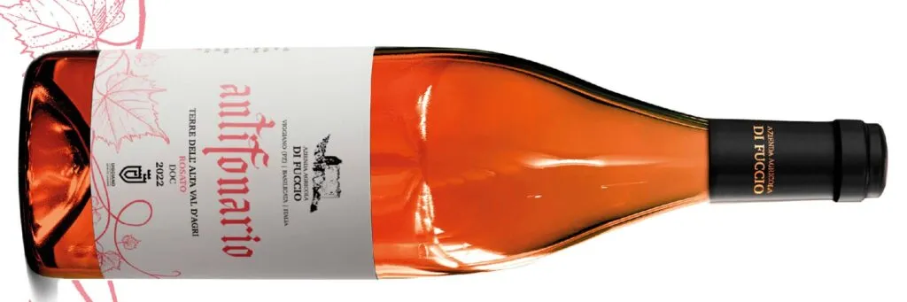 Quarto vino in degustazione il Rosato Terre val d’Agri doc in Foresta Viggiano, l’Antifonario 2022. Un accattivante e un po’ ruffiano blend di Merlot, Cabernet Sauvignon e Malvasia bianca di Basilicata. Spettacolare colore rosato intenso, che si gode dai vigneti posti su un altopiano a 600 mt dii quota e che offre molto da gustare. Superficie vitata appena tre ettari. Vino che si presenta con il colore dell’alba in ottobre.