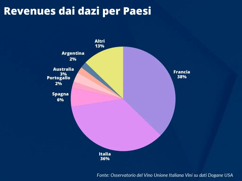 Secondo l’Osservatorio, dall’attivazione delle nuove tariffe a fine luglio i vini italiani hanno subito tariffe aggiuntive pari a 61 milioni di dollari, circa un terzo rispetto al totale import di prodotti provenienti dall’estero. Una classifica ad handicap, che vede primeggiare di poco la Francia (62,5 milioni di dollari), seguita dal Belpaese e, in lontananza, dalla Spagna.