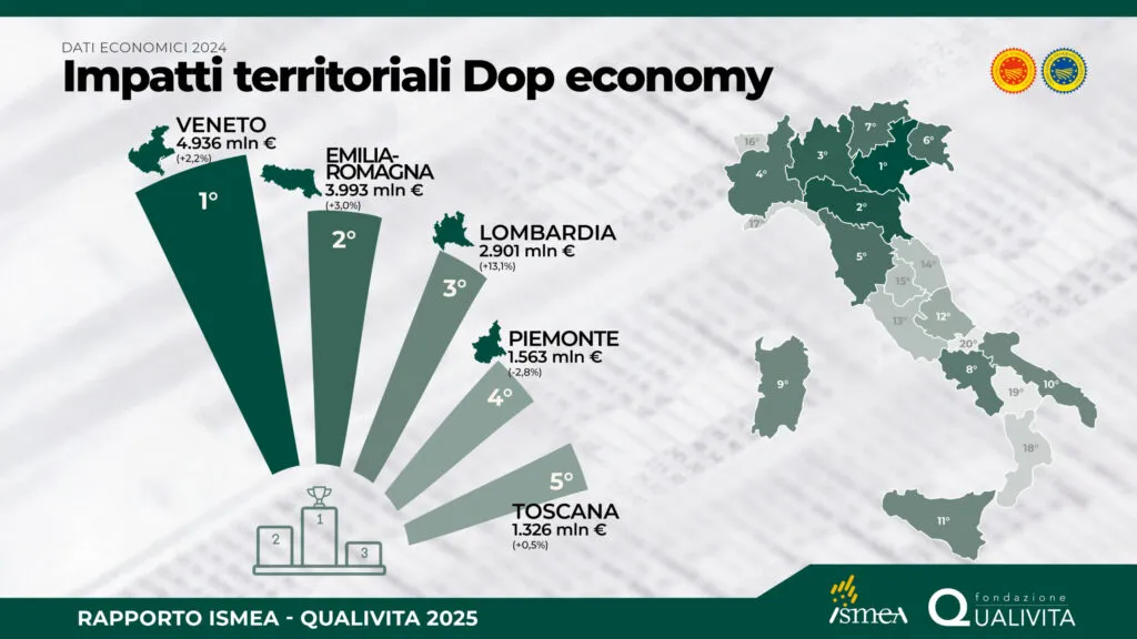 Nel 2024 la Dop economy mostra valori in crescita in quattordici regioni italiane su venti. Le quattro regioni del Nord-Est si confermano “motore pulsante” con un valore aggregato di 11,24 miliardi €: il Veneto sfiora i 5 miliardi di valore, Emilia-Romagna (+3,0%) e Friuli Venezia Giulia (+8,1%) rafforzano ulteriormente il risultato dell’area. Molto bene nel  complesso il Nord-Ovest (+7,1%), trainato per il secondo anno di fila dalla Lombardia, che raggiunge i 2,9 miliardi € e con +13,1% cresce per il quarto anno consecutivo.