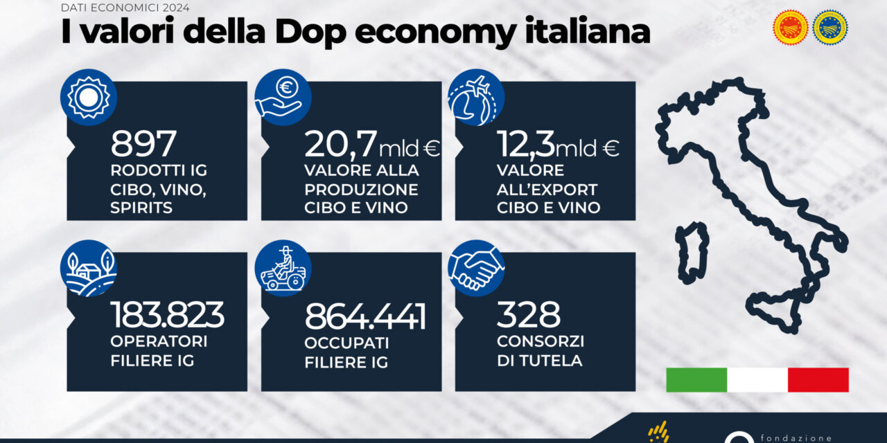 Continua il trend positivo della Dop economy italiana: secondo l’analisi del XXIII Rapporto Ismea-Qualivita il settore raggiunge 20,7 miliardi € di valore alla produzione nel 2024 (+3,5% su base annua), registrando una crescita del +25% rispetto al 2020 e contribuendo per il 19% al fatturato complessivo dell’agroalimentare nazionale. Prosegue per il quarto anno consecutivo l’aumento del comparto del cibo che con un +7,7% supera i 9,6 miliardi €, mentre il vino imbottigliato si conferma stabile a 11,0 miliardi. Ottimi i risultati dell’export dei prodotti DOP IGP, che nel 2024 raggiunge i 12,3 miliardi € (+8,2%) grazie al “doppio record” del settore cibo (per la prima volta sopra i 5 miliardi) e del settore vino (prima volta oltre 7 miliardi).