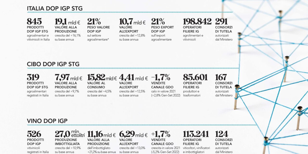Dopo un 2020 segnato dalla pandemia, nel quale il settore aveva comunque mostrato una buona capacità di tenuta e continuità produttiva, il comparto del cibo e del vino DOP IGP nel 2021 raggiunge un valore complessivo alla produzione pari a 19,1 miliardi di euro (+16,1% su base annua) e un export da 10,7 miliardi di euro (+12,8%). Sono risultati record che portano a quota 21% il contributo del comparto DOP IGP al fatturato complessivo del settore agroalimentare nazionale, un quadro che delinea una grande forza propulsiva da parte delle filiere dei prodotti DOP IGP, da sempre espressione di un patrimonio economico per sua natura non delocalizzabile, frutto del lavoro coeso di un sistema complesso e organizzato che in tutto il territorio nazionale coinvolge 198.842 operatori e 291 Consorzi di tutela autorizzati dal Ministero.