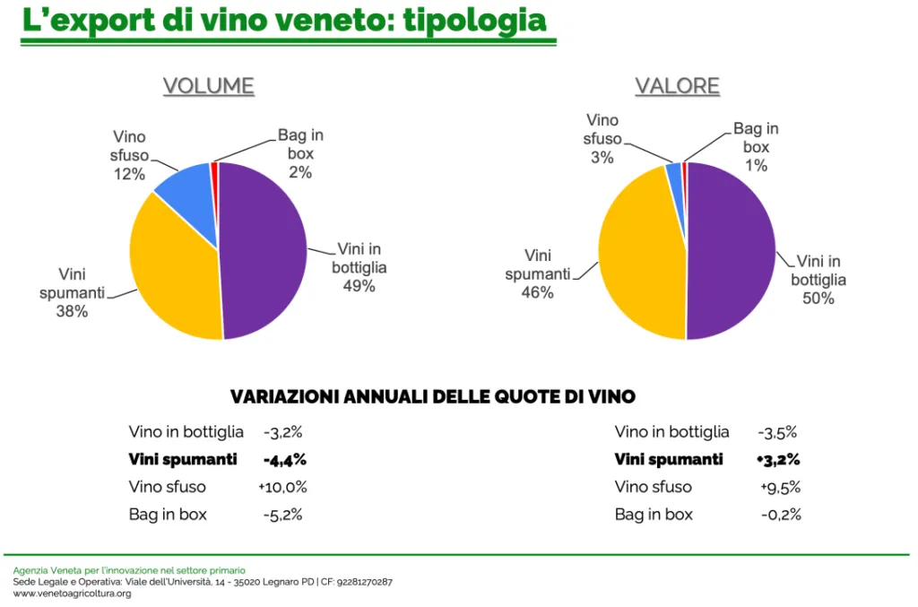 Considerando le varie tipologie l’export del vino veneto conferma il l’aumento del mercato del vino sfuso con un +10% sul 2022 e un +3% in valore. Cala il volume esportato di vini fermi -3,2% e il loro valore -3,5%. Il 2023 vede inoltre un calo delle vendite in volume dei vini spumanti con un -4,4% ma una crescita in valore +3,2%. un dato questo che fa ben sperare per la valorizzazione di questa categoria che per il Veneto è sostanziale.
