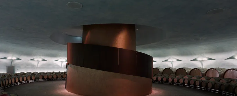 All’interno, l’inconfondibile linguaggio artistico di Pomodoro dà forma agli spazi, trasformando la cantina in un’esperienza immersiva. Come ha spiegato l’artista stesso: “Ho avuto l’idea di una forma che ricordasse la tartaruga, simbolo di stabilità e longevità. Con il suo carapace rappresenta l’unione tra terra e cielo.”