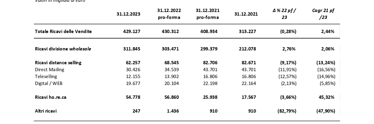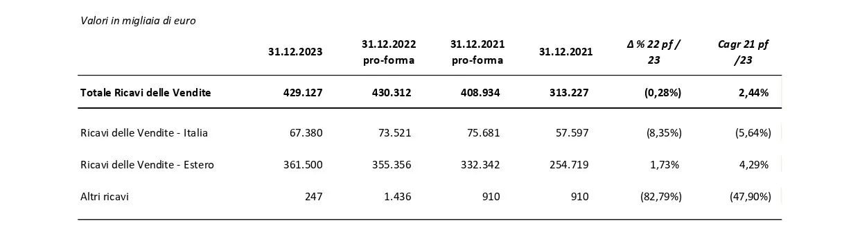 Il dato totale dei ricavi sconta una riduzione delle scorte per oltre 19 milioni di €, portando così i ricavi netti a 413,7 milioni in crescita rispetto al dato 2023 (396,8 milioni dei quali ben 361,5 ottenuti all’estero), ma inferiore al bilancio proforma 23 (che tiene conto delle ultime acquisizioni) che si attesterebbe a 439,5 milioni.