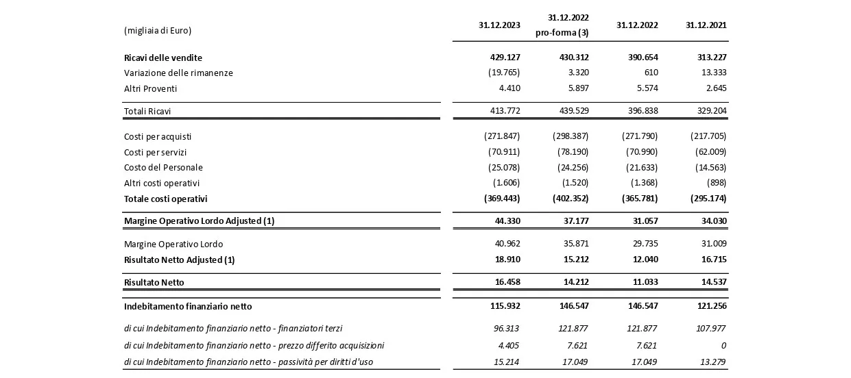 Dove i dati sono ancora più brillanti è la parte economica: il Margine Operativo Lordo adjusted consolidato pari a Euro 44,3 milioni che si confronta con un Margine Operativo Lordo adjusted consolidato pro-forma del 2022 pari a Euro 37,2 milioni. La marginalità sul fatturato è cresciuta al 10,23% rispetto all’8,5% del 2022 riportandosi ai livelli del 2021.