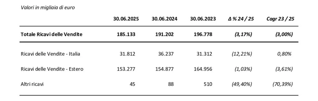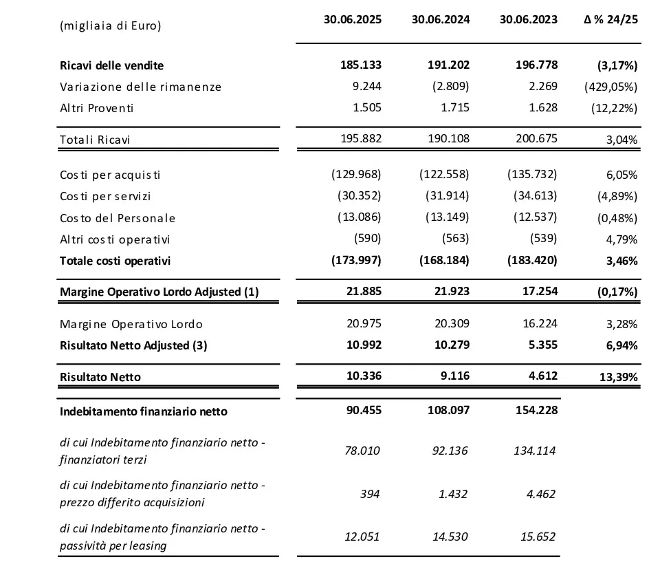 Oggi, il Cda ha approvato la Relazione finanziaria semestrale consolidata al 30 giugno 2025: i ricavi delle vendite al 30 giugno si sono attestati a 185,1 milioni € (- 3,17% vs 2024) di cui solo 8,5% negli USA; la crescita però è forte nel canale Horeca, più 8,8% rispetto allo stesso periodo del 2024; il MOL cresce a 20,97 milioni (+3,28% vs 2024) con un utile netto di periodo pari a 10,3 milioni (+13,4% vs 2024). Contemporaneamente cala l’indebitamento finanziario netto a 90,5 milioni (con un taglio di ben 17,6 milioni rispetto al giugno 2024 e praticamente dimezzandolo negli ultimi due anni)