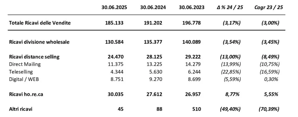 In sintesi si evidenzia: un costante incremento della presenza nel canale Ho.re.ca (+ 8.8% vs il primo semestre 2024 coerente con la strategia del Gruppo di sviluppare prodotti a marchio proprio di fascia premium; una riduzione delle vendite wholesale (vendita alle catene della Grande distribuzione Organizzata, ai monopoli statali) per effetto della riduzione dei prezzi verso livelli pre-inflazionistici più che compensata in termini di marginalità dalla riduzione dei costi dei fattori produttivi e a fronte di un incremento dei volumi di bottiglie vendute; un riposizionamento del canale distance selling (vendita diretta ai privati) su livelli pre-pandemici per effetto del minore appeal di vendite “tradizionali” tramite teleselling e direct mailing.