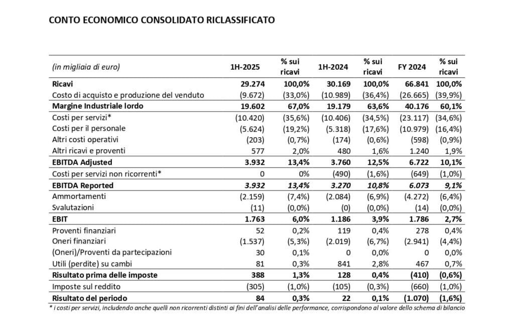 Proseguendo nell’analisi della semestrale, si nota come il visibile miglioramento del margine industriale lordo (da euro 19.179 migliaia a euro 19.602 migliaia, ovvero in termini di incidenza sui ricavi +3,4 bps rispetto al controperiodo e +7 bps rispetto all’intero esercizio 2024) derivi principalmente dal mix-prodotto venduto.