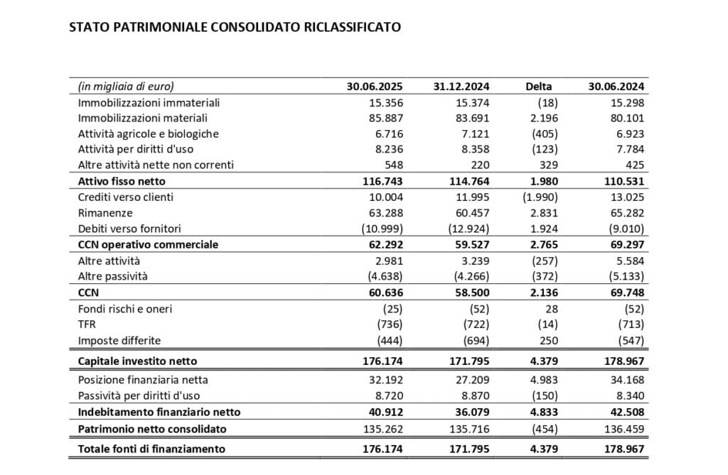 La Posizione Finanziaria Netta consolidata al 30 giugno 2025 ammonta a euro -32.192 migliaia, contro euro -27.209 migliaia al 31 dicembre 2024 ed euro -34.168 migliaia al 30 giugno 2024.
