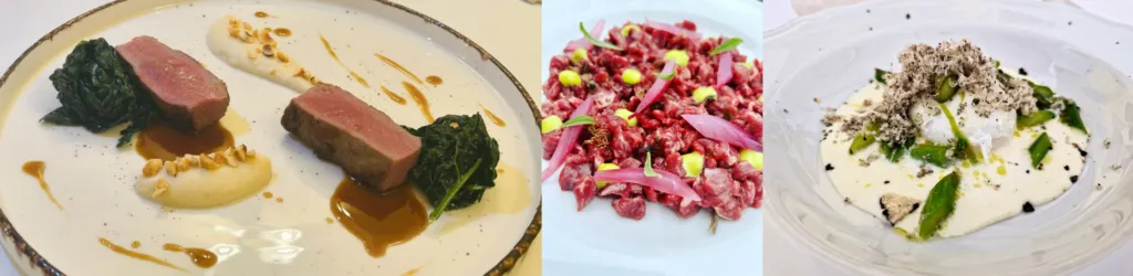La Ciociaria ognitanto salta fuori dai piatti di Mauro Caldaroni, come fosse una scintilla, nella luce dei suoi piatti. Lo si evince dai sapori ben definiti ed intensi delle carni proposte nel menu, le cotture alla griglia, le crosticine sapientemente speziate ed aromatizzate della quaglia, il maialino, che sembrano croccanti di mandorle. L’uso delle spezie e delle erbe aromatiche; la capacità di fondere in maniera gentile e determinata gli ingredienti, per offrire al piatto succulenza ed eleganza.