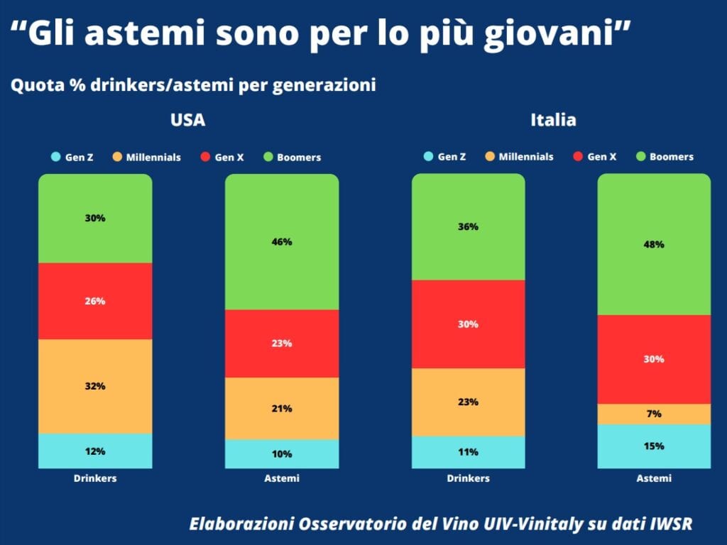 Su entrambe le piazze quasi la metà degli astemi appartengono alla generazione Boomer, seguiti dalla GenX (23% negli Usa e 30% in Italia). GenZ e Millennials rappresentano complessivamente solo 3 astemi su 10 negli Stati Uniti e 2 su 10 in Italia. La tendenza sober curious si inverte nel caso dei cosiddetti periodi “dry”, che negli Usa vedono in prima fila gli under44, con una quota disposta a parentesi temporanee di astinenza che tra i più giovani (GenZ) raggiunge il 60% negli Usa e il 46% in Italia. Più bassa la propensione degli over, con share che si attestano attorno al 30% negli Usa e al 25% in Italia.