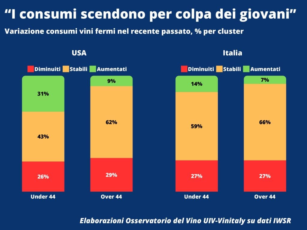 In America – rileva l’Osservatorio –, sono proprio i consumatori maturi a tirare il freno a mano. Mentre tra i giovani under44 sono più quelli che hanno aumentato i consumi (31%) di quelli che li hanno diminuiti (26%), nelle fasce di età più avanzate rappresentano solo il 9% quelli che hanno aumentato il consumo di vino, e salgono al 29% quelli che ne hanno diminuito le dosi. In Italia il calo sembra più trasversale e intergenerazionale e coinvolge oltre un quarto della popolazione (27%) in entrambi i cluster d’età. Anche qui, però, a calmierare in parte il calo sono proprio gli under44 (il 14% quelli che hanno aumentato il consumo, contro il 7% nella fascia over44).