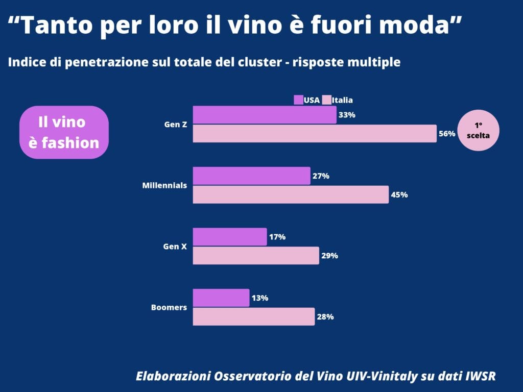 Il connubio vino e cibo rimane importante, ma sembra perdere centralità per i young winelover americani e italiani. Se è vero che “il vino esalta il cibo” per la grandissima parte degli over44, scendono sotto alla metà quelli che si riconoscono in questa affermazione tra i Millennials e la GenZ. Di contro, nel Belpaese la quota dei giovanissimi italiani che vede il vino come un “fashion statement” è esattamente il doppio (56%) di quella dei boomer (28%), e anche i Millennials staccano i GenX per 16 punti percentuali (45% contro il 29%). Un trend rilevante, per cui Iwsr ha coniato una nuova categoria, quella degli “Status Seekers” che, pur rappresentando solo l’11% dei consumatori abituali di vino, negli Stati Uniti realizzano il 24% del volume e il 35% dei valori generati dai regular wine drinkers.