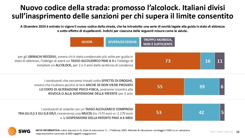 La netta maggioranza degli italiani è convinta comunque che le nuove misure abbiano contribuito a modificare almeno in parte le abitudini di consumo di alcolici anche se chi ne fa un uso abituale probabilmente continuerà a farlo. Questo dato trova in parte conferma anche nell’esperienza diretta degli intervistati: il 73% ha limitato se non persino azzerato il consumo di alcolici quando deve mettersi al volante, mentre il 17% continua a bere con la stessa frequenza senza modificare le proprie abitudini di guida. Questo dato sale al 25% tra i più giovani, convinti più di altri che uno o due calici di vino non siano in grado di alterare le capacità di guida.