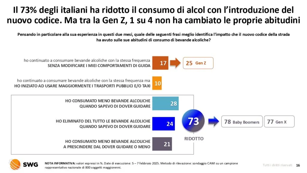 La netta maggioranza degli italiani è convinta comunque che le nuove misure abbiano contribuito a modificare almeno in parte le abitudini di consumo di alcolici anche se chi ne fa un uso abituale probabilmente continuerà a farlo. Questo dato trova in parte conferma anche nell’esperienza diretta degli intervistati: il 73% ha limitato se non persino azzerato il consumo di alcolici quando deve mettersi al volante, mentre il 17% continua a bere con la stessa frequenza senza modificare le proprie abitudini di guida. Questo dato sale al 25% tra i più giovani, convinti più di altri che uno o due calici di vino non siano in grado di alterare le capacità di guida.