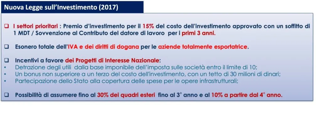Il sistema legislativo è molto favorevole all’investimento con libertà di investimento nella maggior parte dei settori, semplicità nelle procedure di insediamento, libertà di trasferire gli utili del capitale e delle plusvalenze, protezione della proprietà intellettuale, facilità di import ed export grazie a procedure doganali semplificate. La nuova legge sugli investimenti del 2017 prevede una serie di azioni favorevoli all’insediamento come si legge nel diagramma qui sotto.