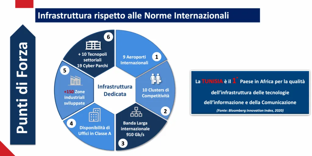 L’andamento degli Investimenti Diretti Esteri (IDE) in Tunisia aumentano di 160 unità per un totale di circa 50 milioni di euro e un totale di posti creati pari a 1363. I settori rimangono sempre gli stessi prima citati, anche se il settore agroalimentare rimane un pò tra gli ultimi ancora da potenziare veramente. Nel Nord Africa la Tunisia (fonte Bloomberg 2020) rimane il primo paese per qualità di infrastrutture delle tecnologie dell’informazione e della Comunicazione. Ci sono + 65000 diplomati ogni anno con alti livelli di multilinguismo. Prima economia innovatrice nel Nord Africa (65.ma su scala mondiale).
