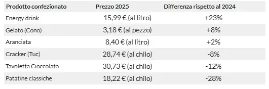 Se volete aggiungere una cola preparatevi al salasso: il costo del marchio più diffuso, Coca Cola, è di circa 8 euro al litro (in bottigliette di piccolo formato, tra 450ml e 700ml), più del quintuplo rispetto ai supermercati dove costa in media circa 1,39 euro al litro. Stesso discorso per il gelato confezionato, che oltretutto aumenta del 5% rispetto all’anno scorso: per uno stecco ricoperto al cioccolato bisogna considerare di spendere più di 3 euro, più del doppio rispetto ai supermercati (dove, ad esempio il gelato Algida Magnum costa in media 1,30 euro). E per uno snack confezionato? Altroconsumo ha rilevato anche i prezzi di altri prodotti confezionati per uno snack durante il viaggio. Spiccano i costi e gli aumenti degli energy drink (tipo Red Bull in particolare, che è il più presente e salato): si spendono quasi 16 euro al litro, il 23% in più rispetto all’anno scorso.