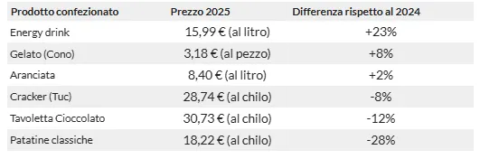 Se volete aggiungere una cola preparatevi al salasso: il costo del marchio più diffuso, Coca Cola, è di circa 8 euro al litro (in bottigliette di piccolo formato, tra 450ml e 700ml), più del quintuplo rispetto ai supermercati dove costa in media circa 1,39 euro al litro. Stesso discorso per il gelato confezionato, che oltretutto aumenta del 5% rispetto all’anno scorso: per uno stecco ricoperto al cioccolato bisogna considerare di spendere più di 3 euro, più del doppio rispetto ai supermercati (dove, ad esempio il gelato Algida Magnum costa in media 1,30 euro). E per uno snack confezionato? Altroconsumo ha rilevato anche i prezzi di altri prodotti confezionati per uno snack durante il viaggio. Spiccano i costi e gli aumenti degli energy drink (tipo Red Bull in particolare, che è il più presente e salato): si spendono quasi 16 euro al litro, il 23% in più rispetto all’anno scorso.