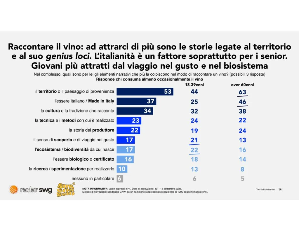 Per SWG – una delle più quotate società di sondaggi italiane che ha interpellato un solido campione statistico – il vino ci appartiene, si intreccia alla nostra storia, presidia tradizioni, valorizza territori, costruisce paesaggi e segna l’identità del Paese. Due italiani su cinque si definiscono ‘consumatori evoluti’ mossi da una particolare attenzione verso le caratteristiche di prodotto, se non da una vera e propria passione per le storie racchiuse in un calice. In particolare per quelle che fanno ‘comunità’: i racconti sul territorio ci attraggono più delle certificazioni; il genius loci è un driver narrativo più potente della storia del produttore.