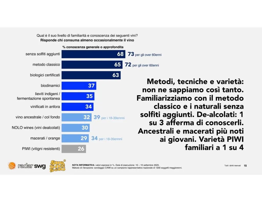 Tuttavia, sul piano della consapevolezza tecnica della familiarità con i metodi, le varietà e le tendenze del mercato il riscontro dei consumatori italiani è piuttosto modesto. Familiarizziamo con il ‘metodo classico’, con le certificazioni e con i vini ‘senza solfiti’. Ma non più di 1 su 3 dichiara di conoscere (almeno in linea generale) i princìpi dei ‘NOLO’, degli ancestrali, dei macerati o le varietà PIWI. In sintesi, il rapporto degli italiani con il vino sembra molto più emozionale che informato.