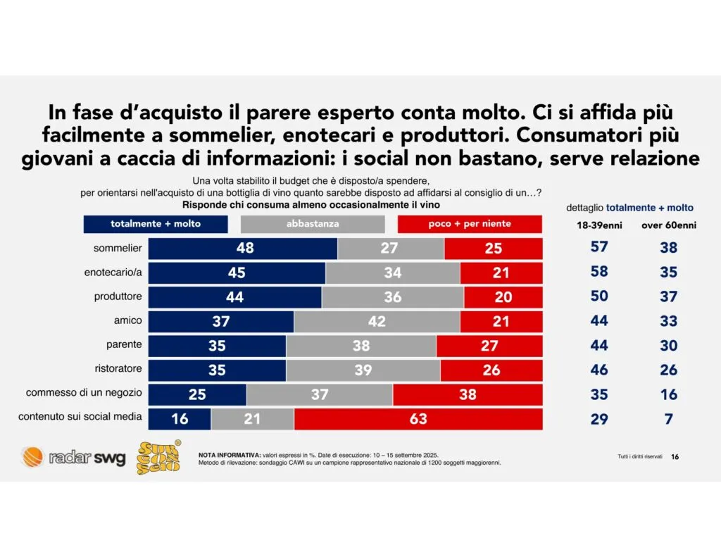 E forse anche per questo in fase d’acquisto il parere esperto conta molto: la propensione ad affidarsi al consiglio di sommelier, enotecari e produttori è elevata. Tra i giovani, in particolare, si registra un maggior bisogno di informazione; anche per loro i social non bastano: serve relazione. Il mondo del vino ci coinvolge quando racconta le comunità. Ma sui metodi, le varietà e i processi non siamo così informati.