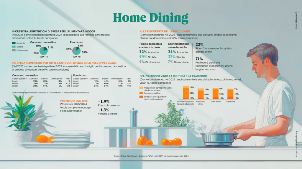Benessere e “casalinghitudine” regnano sovrani anche quando si delineano le tendenze sul cibo; sempre più home dining e long cooking con il consumo domestico in crescita nelle intenzioni e quello fuori casa rimasto appannaggio dei più abbienti (se la upper class sale di 13 punti, la lower indietreggia di 35 e anche la classe media mostra segnali di fatica attestandosi su -14). In linea con questa tendenza il 71% privilegerà piatti dalle preparazioni lunghe a discapito dell’acquisto di piatti pronti, mentre il cibo preferito sarà salutare (66%), semplice (53%) e tradizionale (51%).