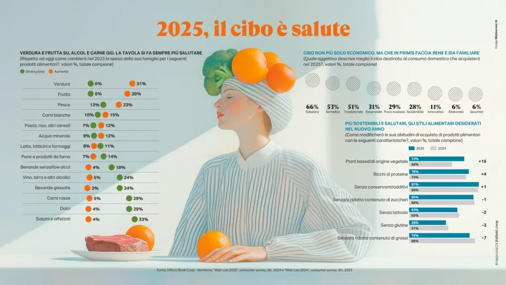 E infatti nella crescita delle intenzioni di consumo alimentare prevalgono (almeno nelle intenzioni) le diete più salubri con un maggior contenuto di verdure (31%), frutta (28%) e pesce (23%), mentre appaiono in calo soprattutto salumi (33%), dolci (29%), carni rosse (29%) e bevande alcoliche (24%). Avanguardia di queste tendenze i giovani (18-25enni) che dichiarano di voler acquistare nel 2025 cibo plant-based o comunque di origine vegetale nell’85% dei casi contro il 70% degli over 26 (26-70enni). Interessati anche al senza glutine più degli altri (29% vs 46%), si lasciano tentare più spesso anche dal ready to eat (76% vs 65%).