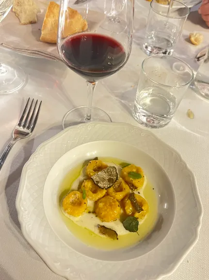 Il primo piatto ha visto protagonisti gnocchetti di zucca ripieni con crema al Morlacco del Grappa, Tartufo del Grappa e mandarino, abbinati alla Recantina di Tenuta La Carpena. La titolare della tenuta ha raccontato che dieci anni fa sono state piantate le prime viti di Asolo Prosecco, mentre nel 2020 sono arrivati i primi impianti di Recantina, con la prima vinificazione nel 2023. Nel 2024 è stata prodotta una seconda versione del vino, vinificata solo in acciaio per preservare le caratteristiche del vitigno.
