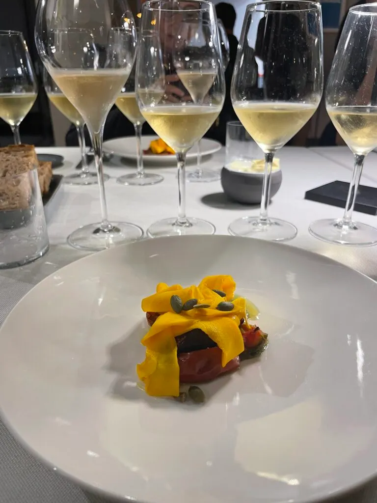 Tra le pietanze scelte, pomodorini, zucca, fichi e salvia, un piatto che, a prima vista, può sembrare semplice, ma che in realtà rivela una complessità sottile. A spiccare è la cura con cui vengono trattati i vegetali, veri protagonisti del piatto. Come primo, tagliolini con pesche ed elicriso, una pasta leggera e delicata, avvolta da un profumo dolce, grazie alla pesca. Un abbinamento insolito, ma incredibilmente riuscito.