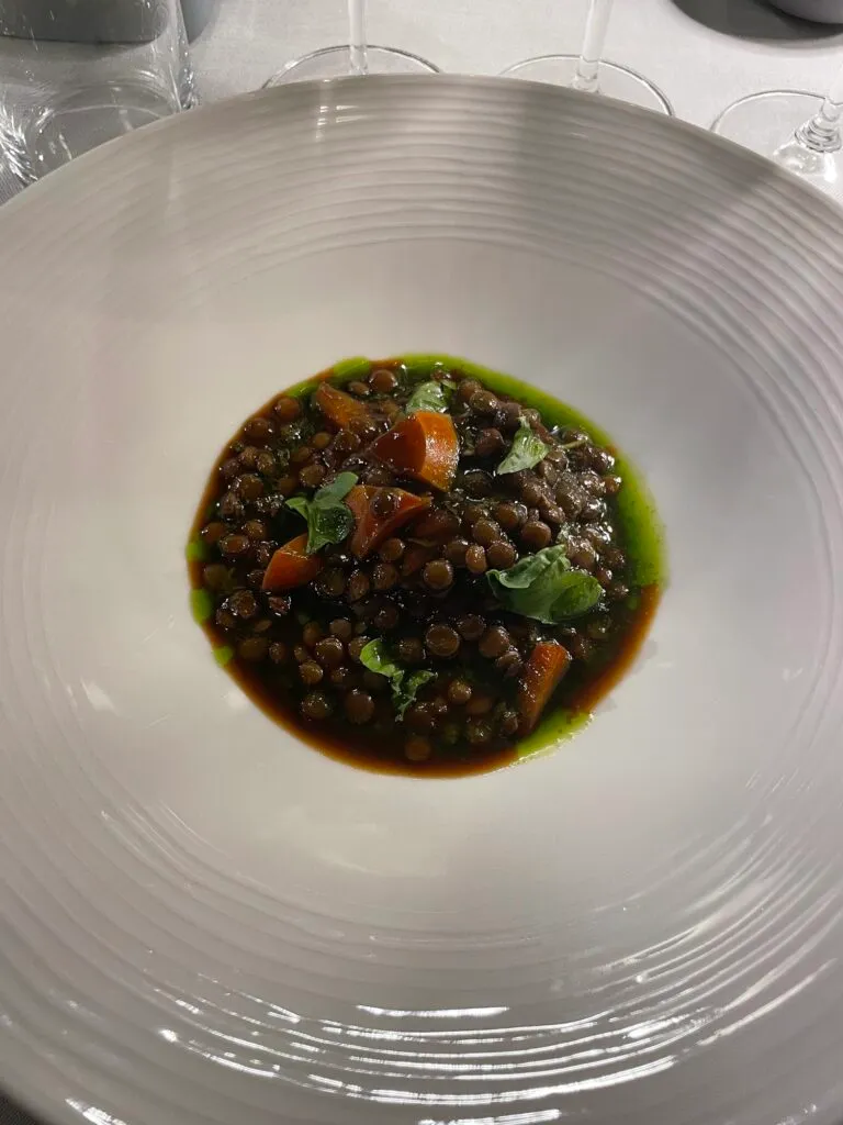 Infine, lenticchie, susine ossidate e pane arrosto, un piatto elegante e ben bilanciato. Il pane, base umile ma fondamentale, accompagna con discrezione gli altri ingredienti, in una preparazione che, pur nella sua semplicità, si distingue per precisione e meticolosità. Il pensiero finale, dopo questa cena fuori diversa dal solito, è lo stupore che ogni piatto è riuscito a suscitare, senza mai cadere nella banalità, nonostante l’uso di ingredienti semplici e quotidiani.